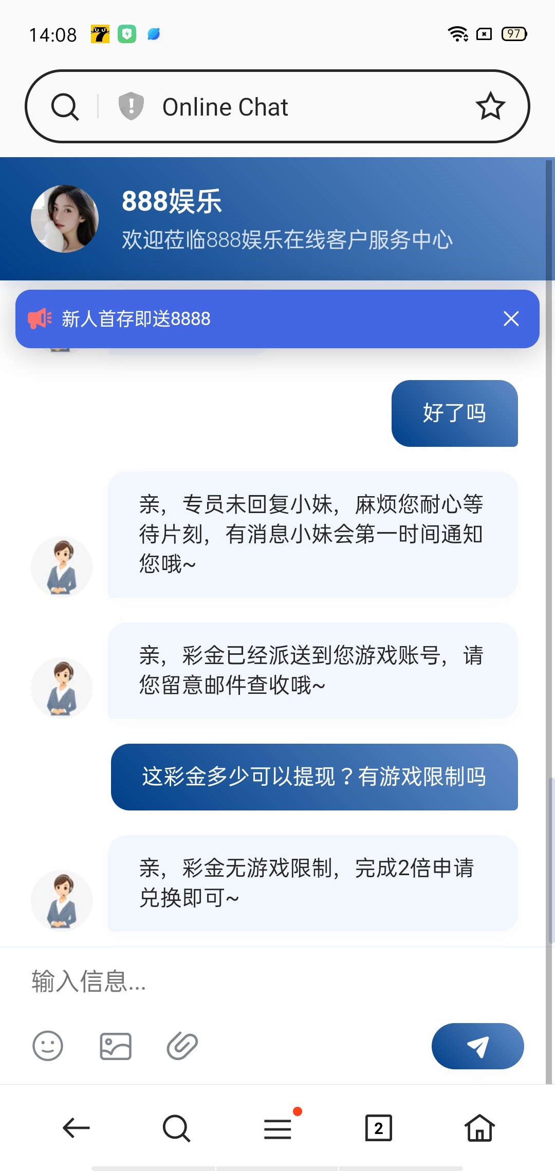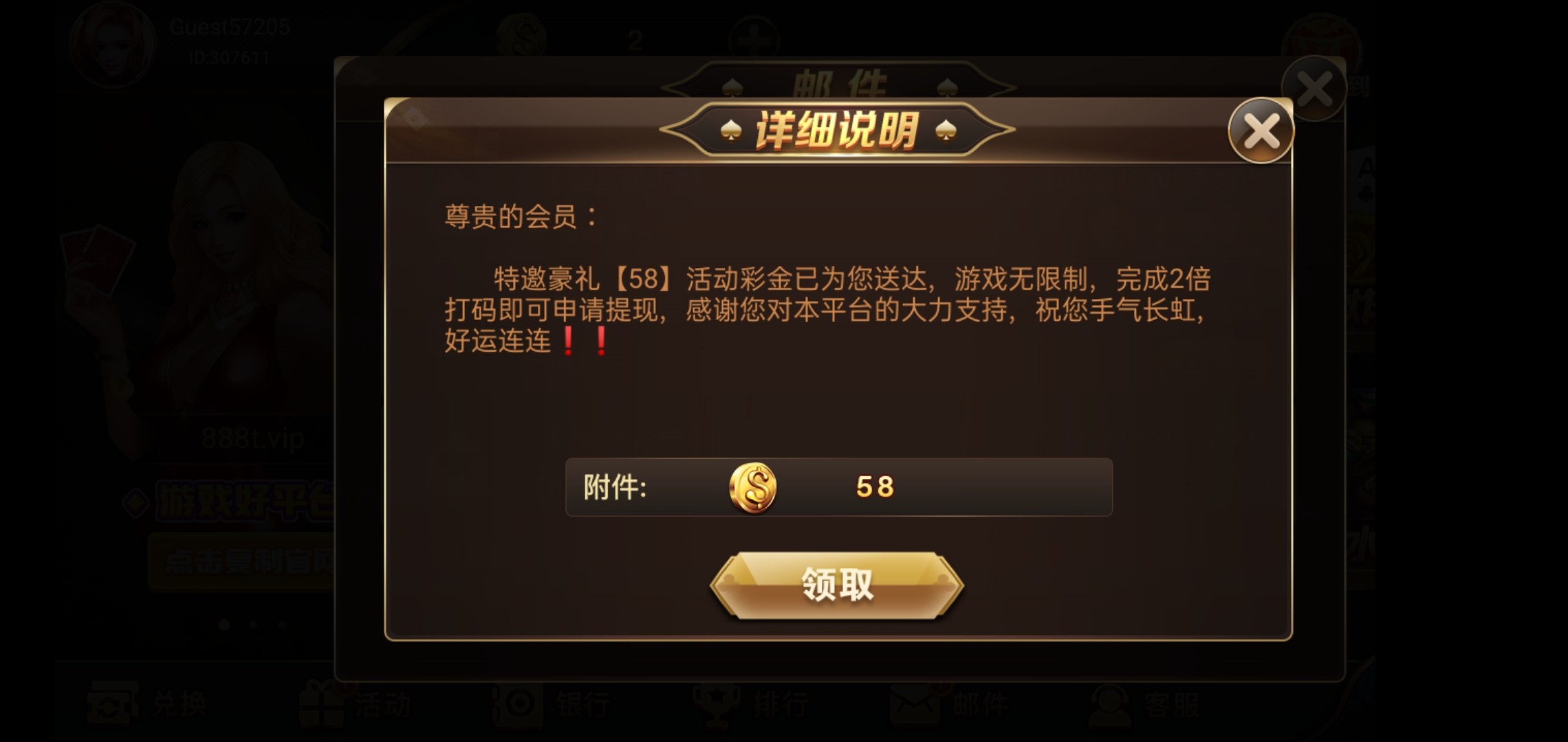 接的境外电话说是送58两倍水提,不过我打到100提现,提示要最少501提,没打出来不知道能不能出款!