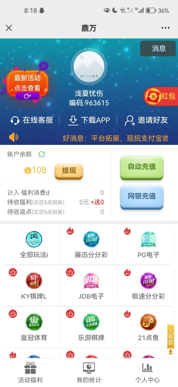 登陆就有108必须是以前充值娱乐过的或者拉过人,以下二维码都是官方的撸到老哥赏口饭