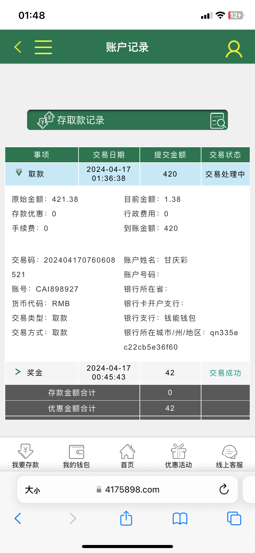 提了500,退回扣80,提现上下限都是420 已到账 感谢楼主