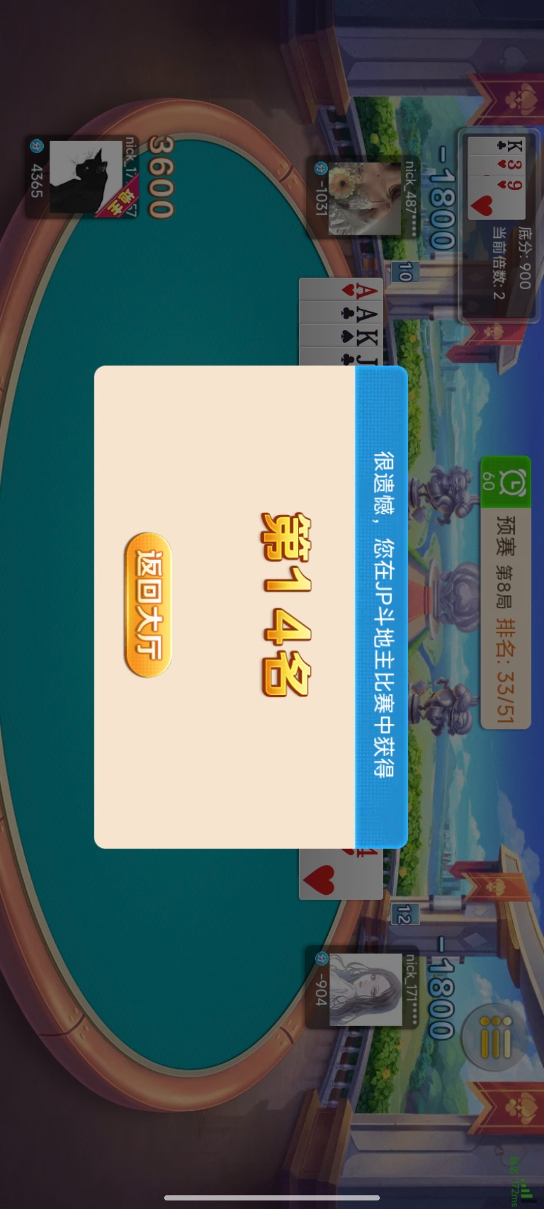 斗地主比赛都假了,第八局结束积分还有4千多,第九局就不给机会参加比赛了,那为什么我上一次第8局结束积分6千多,显示第二名,到了第九局还要参加,结果第九局做农民输了,不入为12名淘汰