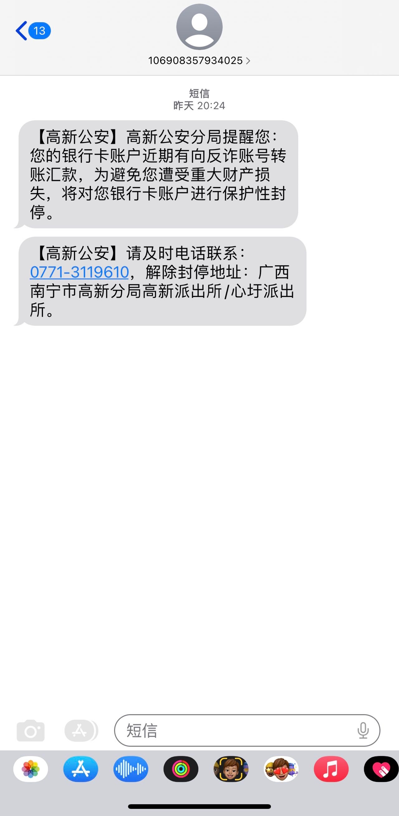 老哥,我这是不是也挨了,本来银行卡被查封,然后查了五天解封了,然后陆陆续续的来一些这种短信,先是银行那边发短信过来说去解封,没去然后这个派出所就发短信来这个了,几天了,没得去,会不会被摁头