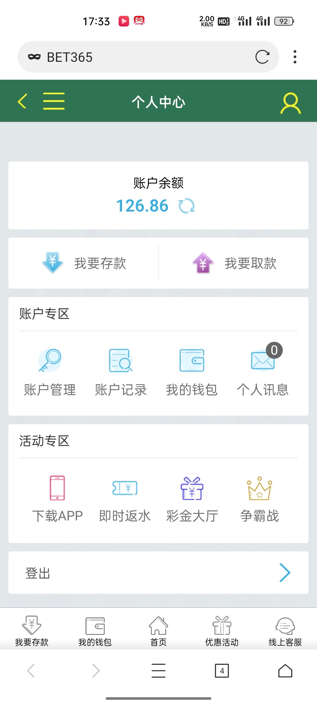 有条毛,这个平台共充了4千多,输一千在右,两个多月没充值了,没见有回馈过,星期六日,抢个红包都抢不到