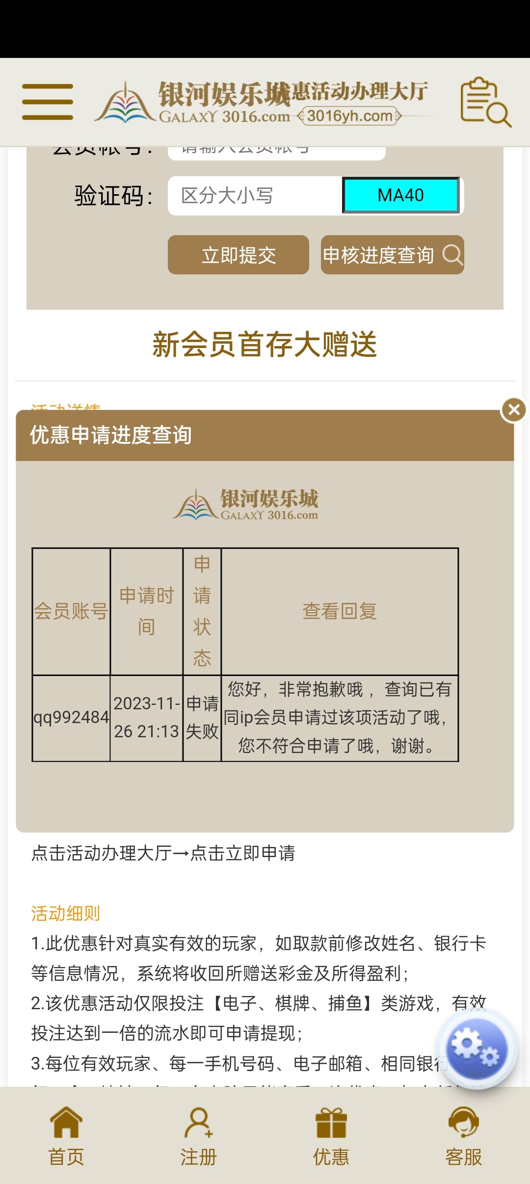 这种台子彩金不用想了!我确实是新用户,想充值的自己试,再说一次,说你重名,一切活动都申请不了!