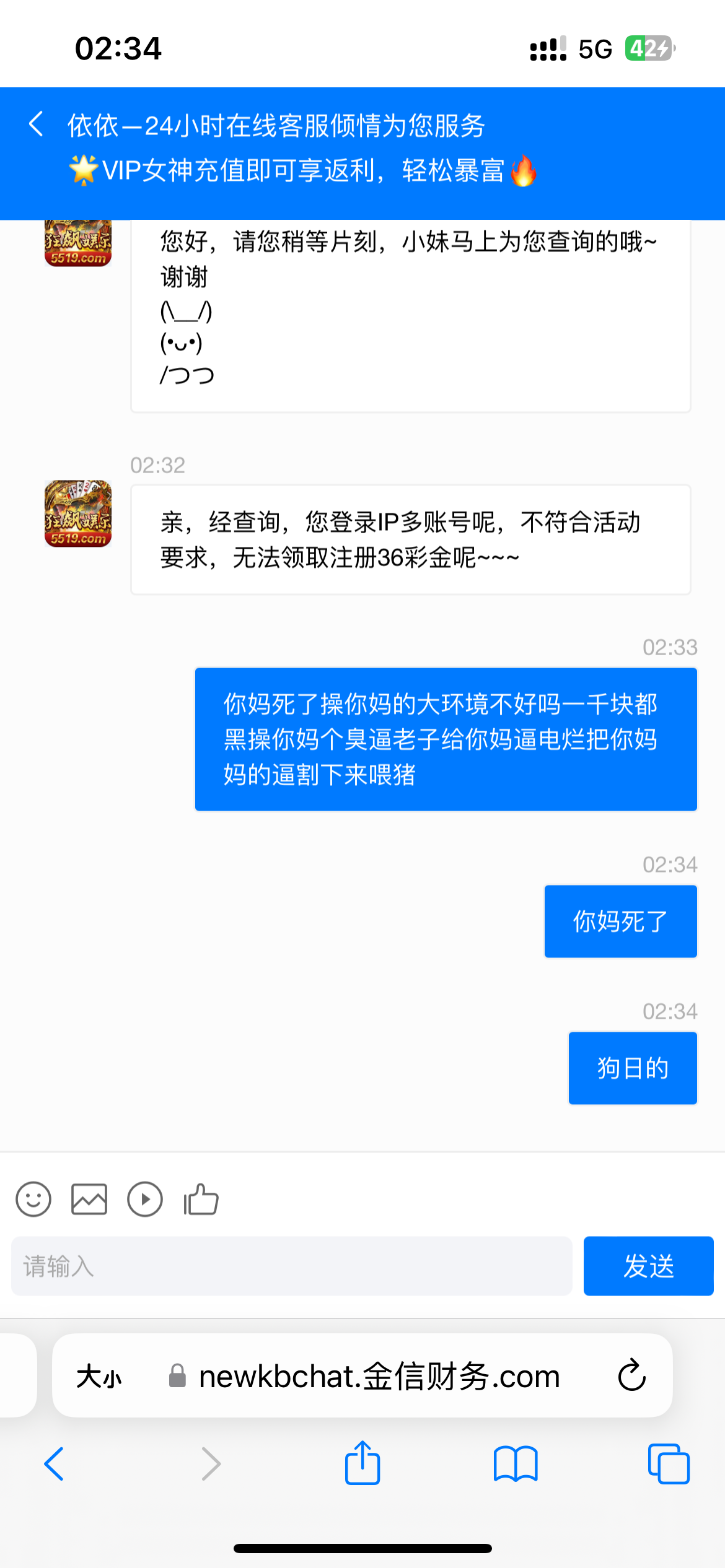 上了一千玩龙虎斗打到2.3,上号他妈的就冻结了,还解不开,一直审核,帮忙骂一下客服,抽十瓶牛子