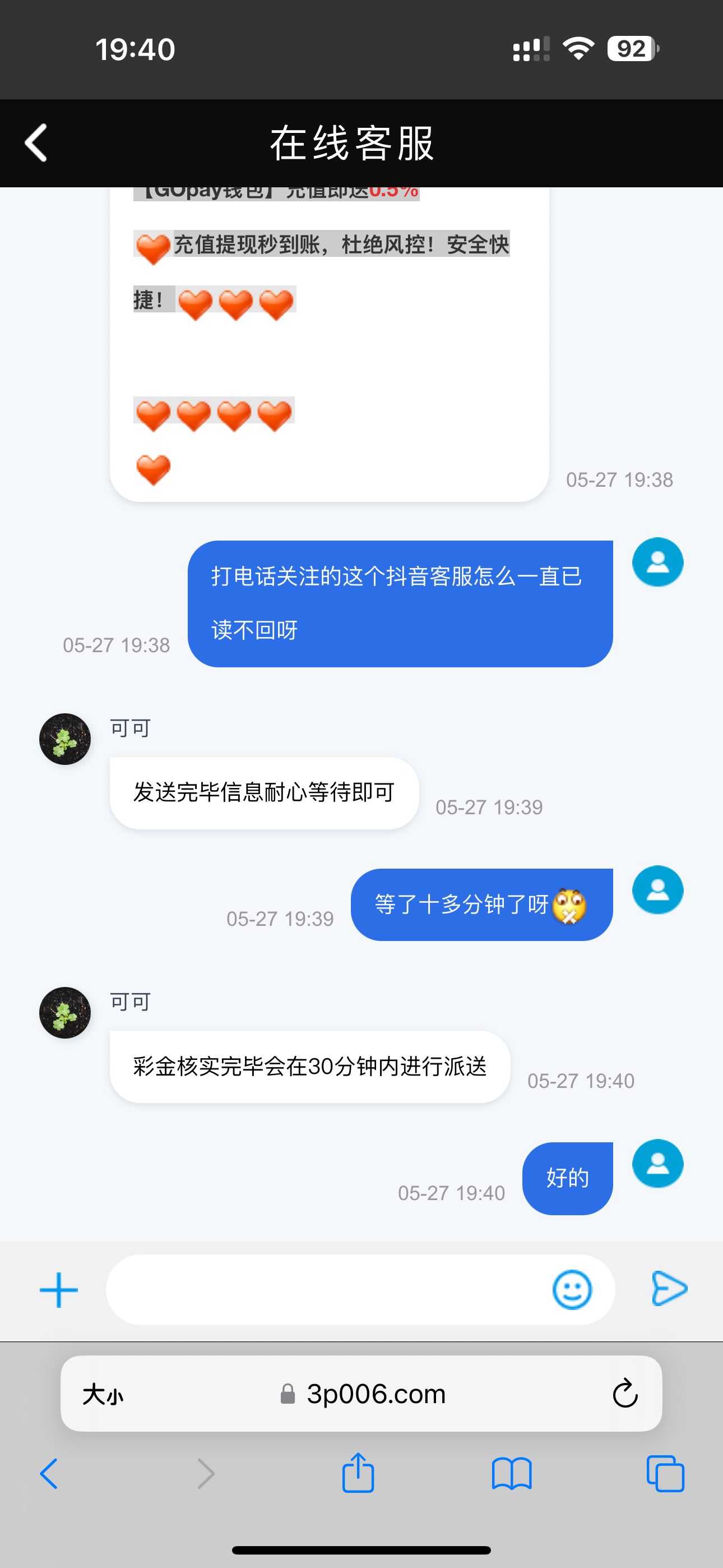 老用户有账号的去  跟客服说领取电话彩金 发电话号码给她然后她就给抖音号给你关注再发电话名字账号给抖音这个人 不知道是不是统一这个抖音aa2000162636  你们也可以直接关注然后私信试一下 发了之后30分钟内到  抖音不回复的  但还是最好找客服问一下发抖音再去吧  反正碰瓷有就有  没有就没有  狗叫也没用  网址3p006.com