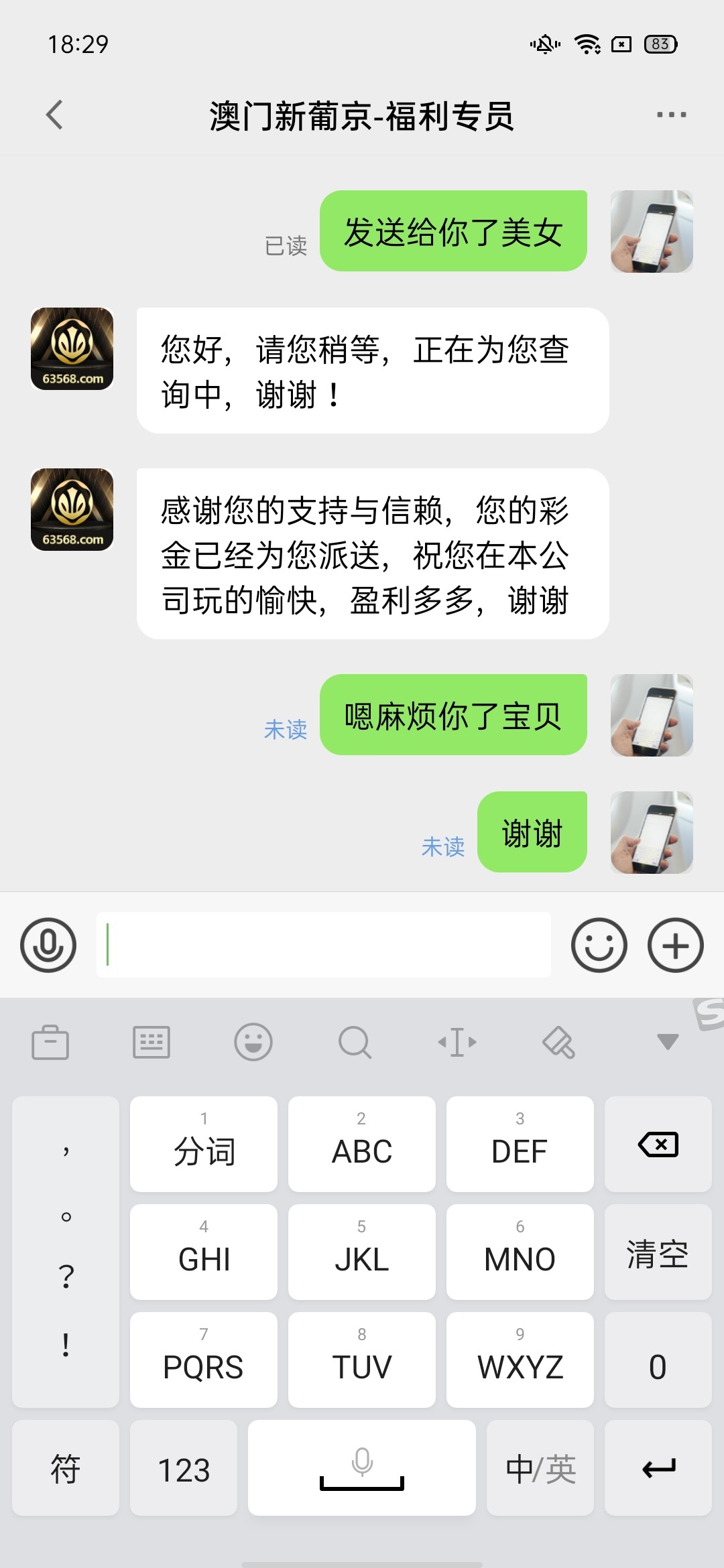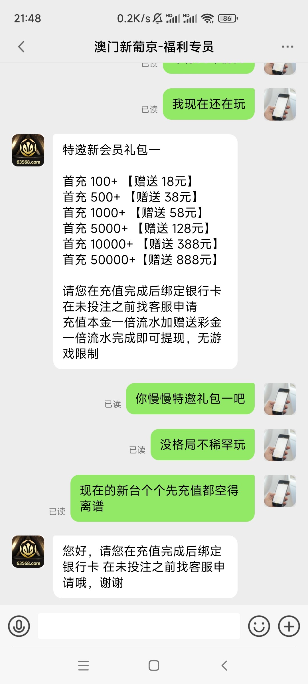 新用户下载APP注册绑定好银行卡消息里面添加福利专员(77777)然后发送注册手机号申请APP18彩金,亲测秒送,看到速去易黄,切记勿充值。