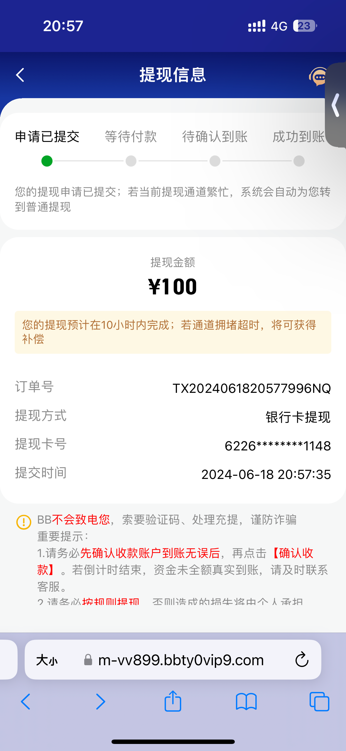 提了300,还有100确认出款中