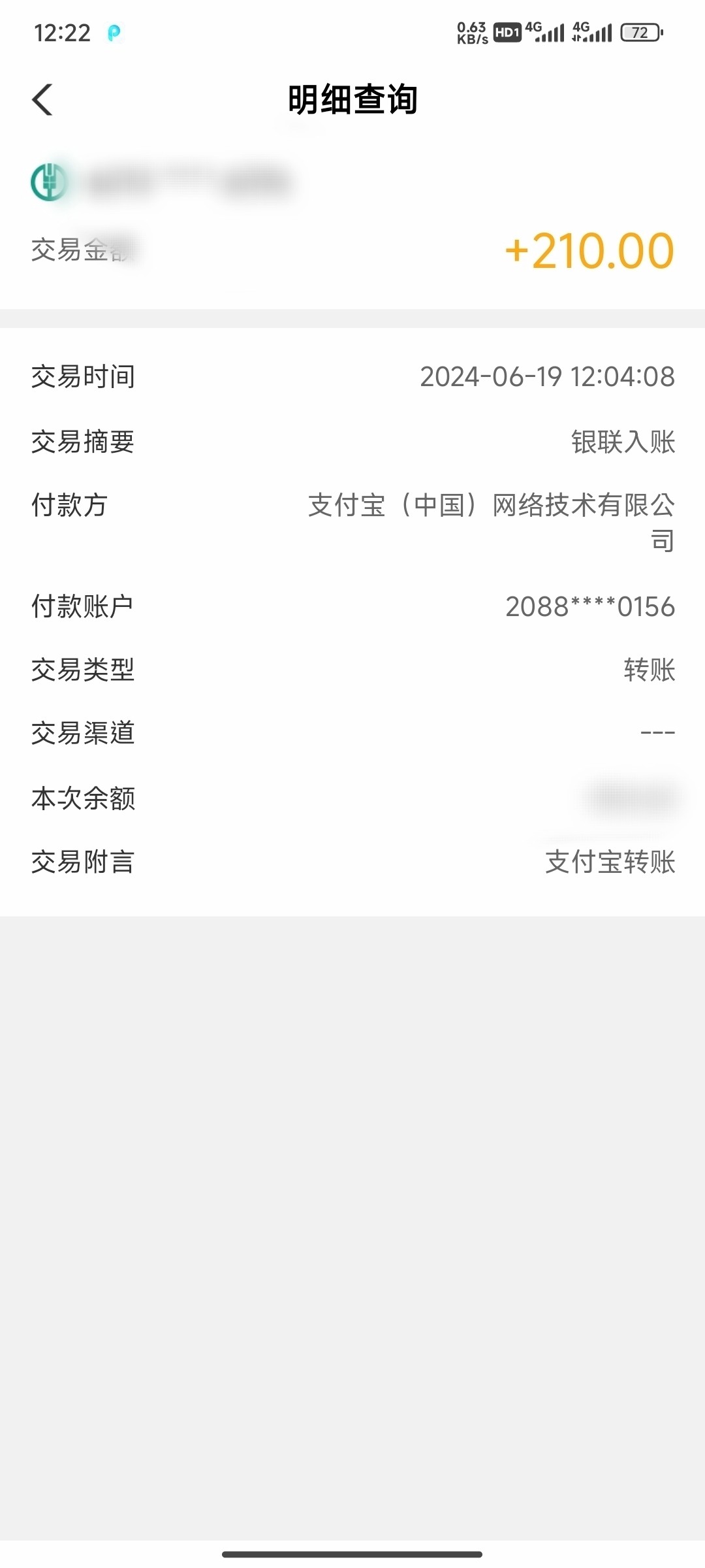银行到账截图