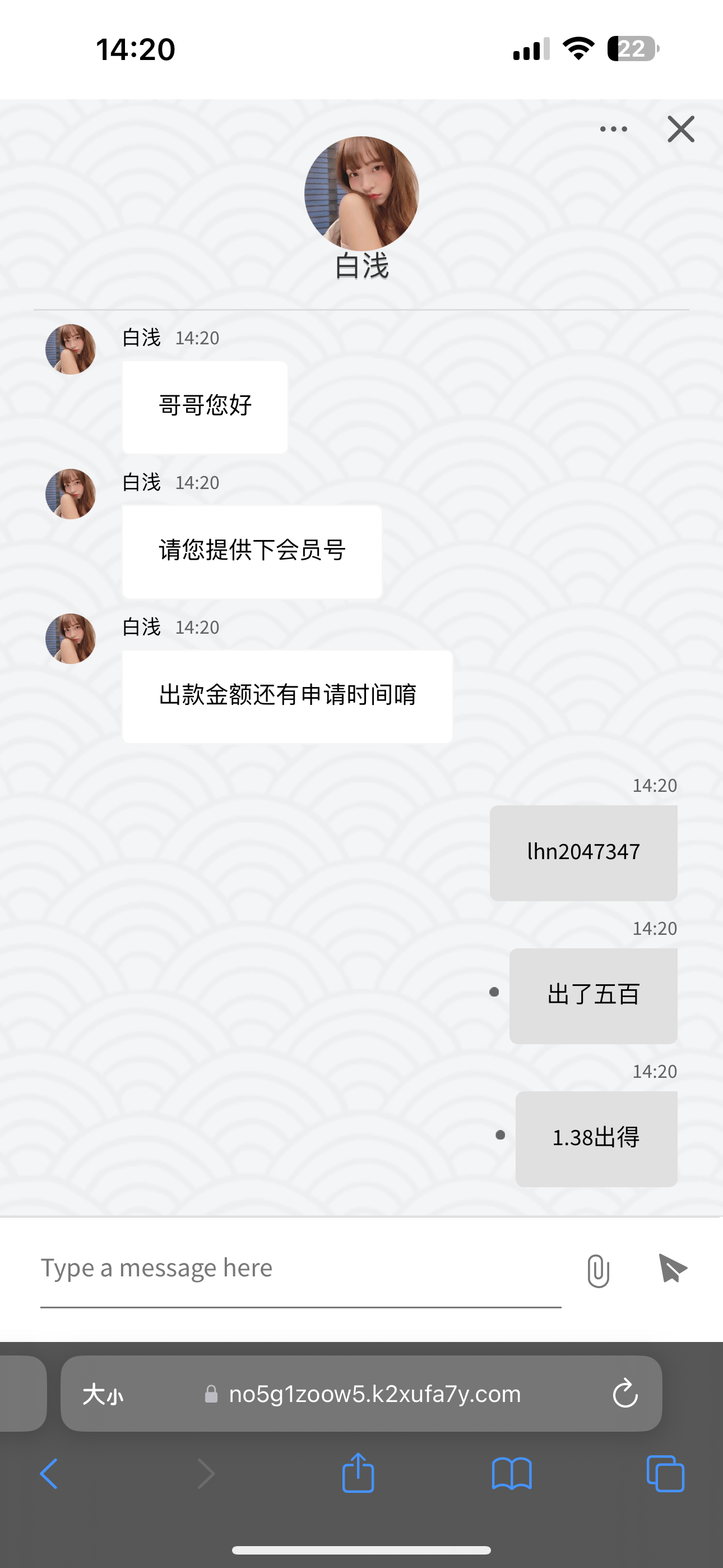 188送188,彩金六杯水,本金1水一共1316流水,不限制游戏。我玩了会电子就去白家哭了。一个号提了500,一个提了335,提款提银行卡和购钱包。优惠有写,下面申请流程,先注册好账号,问客服188送188如何申请,客服会问你是如何知道的网址,你就说朋友告诉的,他会问你朋友账号多少,老哥们可以报我的,因为我参加过了,看上面图片就行。我之前也是报朋友账号,他会查询,并且你还没申请,还未存款的情况下时候有可能就让你提交手持,也可能在你出款的时候让你提交,介意的可以不玩。你如果提交了手持后和Qq,他会安排专员加你Qq,你存款完他就给你送了。另外提款的时候10分钟没到账,就去问客服取款多久到账,他会让你提交手机,银行卡号,钱包地址,姓名,Qq邮箱,会给你邮箱发个验证码,收到后提交给他,1分钟秒下款。说了那么多,希望撸出来的老哥发个牛子或猪脚饭,不发也无妨,一旦发出来必定人多去撸,可以在不同时间去参加,别一股脑全冲进去。有多名字的直接可以去对打白家哭。