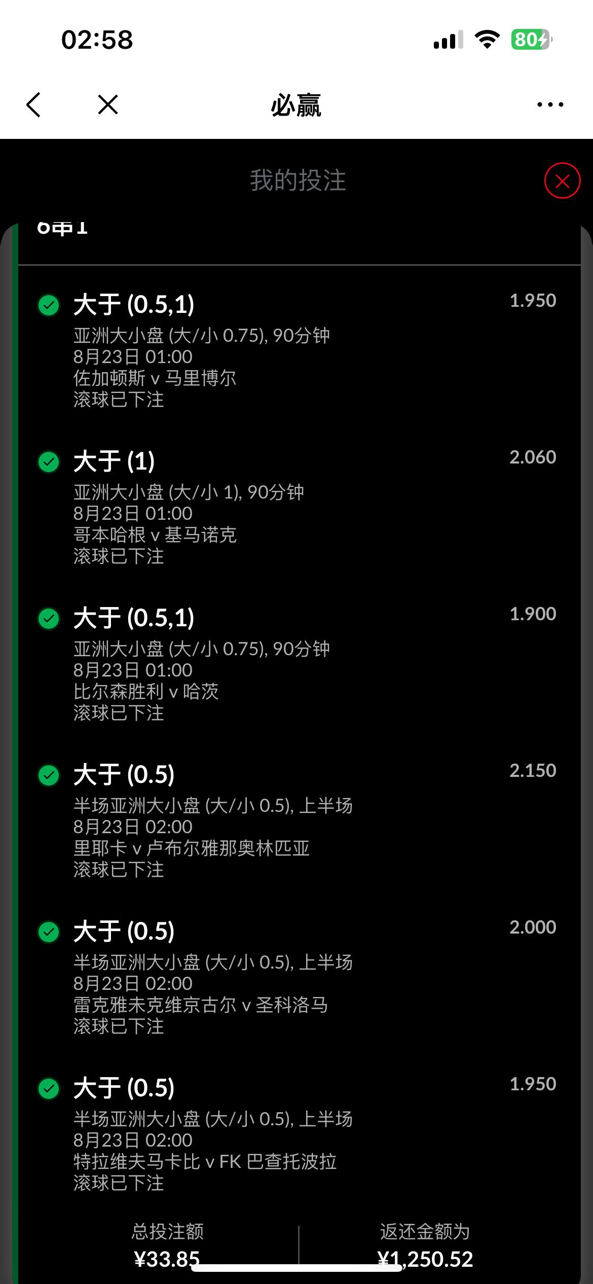 一手6串1没敢下大  就下了33块赢1200  有一场赢一半,要不然就是赢2000多了