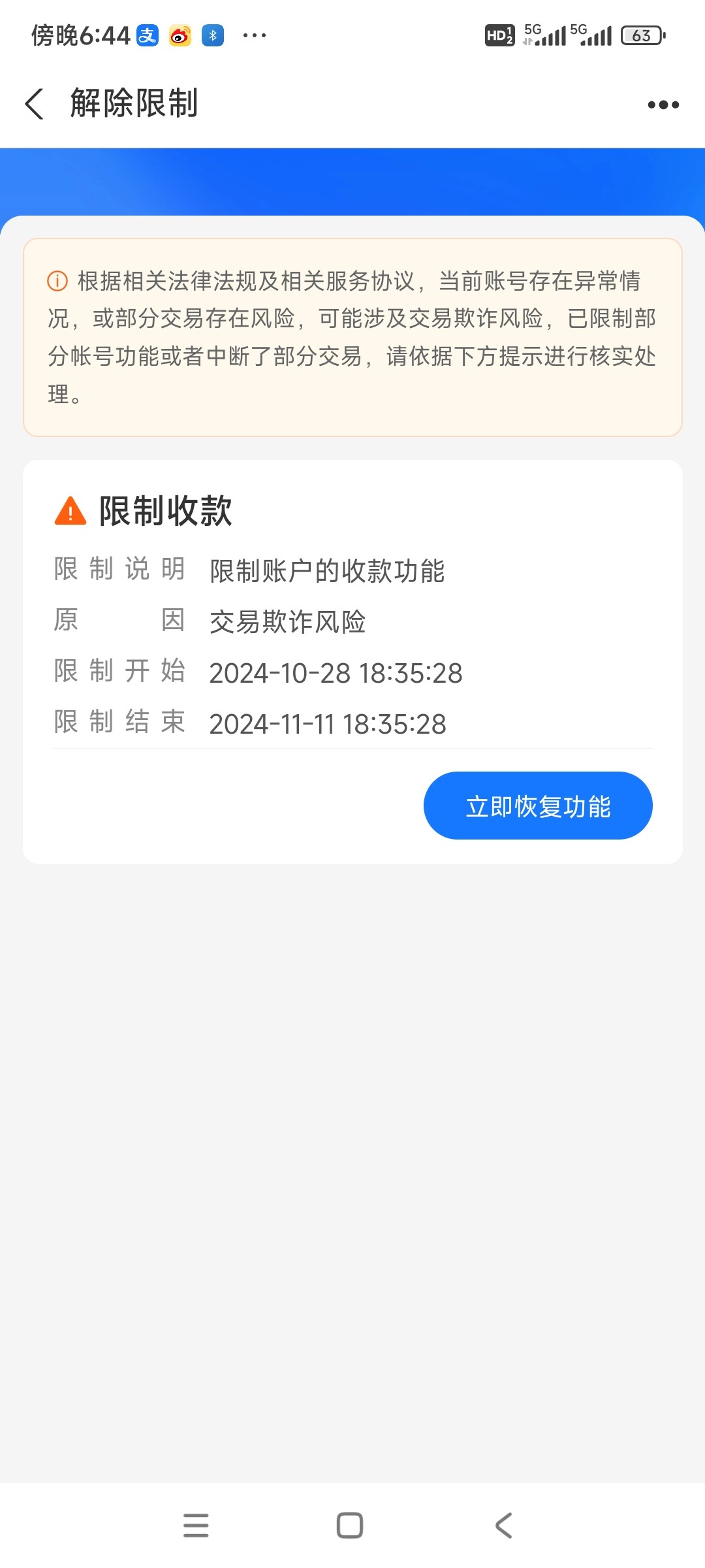 昨天我上了麻烦200给6麻将出400支付宝他复制号扫过来我支付宝风控扫不过 然后换上500多提卡一直审几个小时,后面取消半夜玩剩300一把败家挂壁,今天醒了看看有没有反水结果禁用钱没了禁用了哈哈。