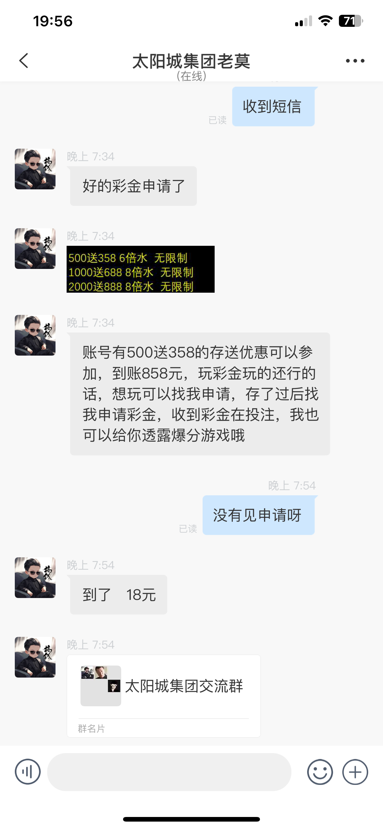 咋又是这个老莫,另一个太阳城也是500送388也是找的老莫送的优惠券,但是不是你这个台,我打了出款了