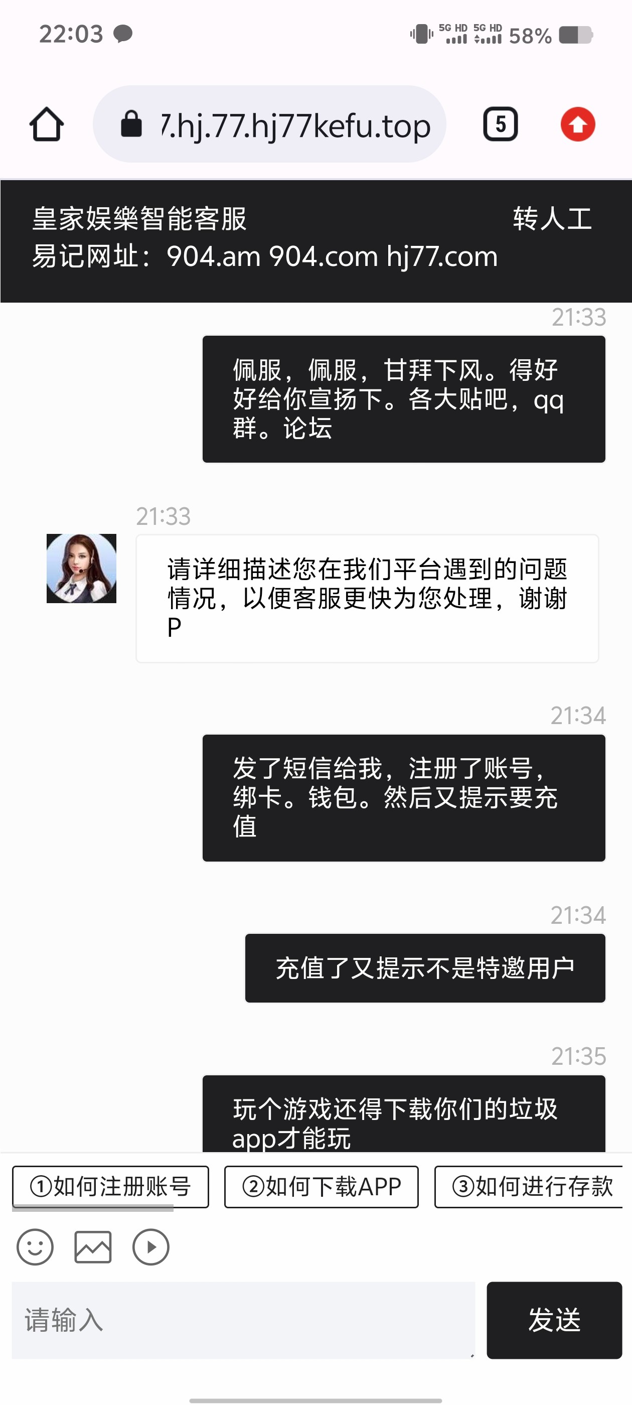 我昨天也是这个司马台子,注册好了让手机验证,验证完要绑卡,绑了又要第三方钱包绑定,绑定好了又让充值,充值完了让下app 才能游戏  我草你妈了个逼的  没见过这么煞笔的台子  现在都是这种司马台  天天发短信  链接我现在都不想点开了 全直接删掉