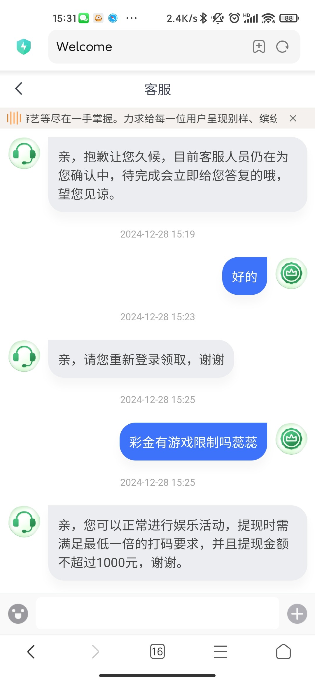 之前发过的项目,有号的用户上号联系在线客服申请电话回访彩金,彩金没有限制1倍流水提现,人多易黄,黄了就等人少再去碰试试。