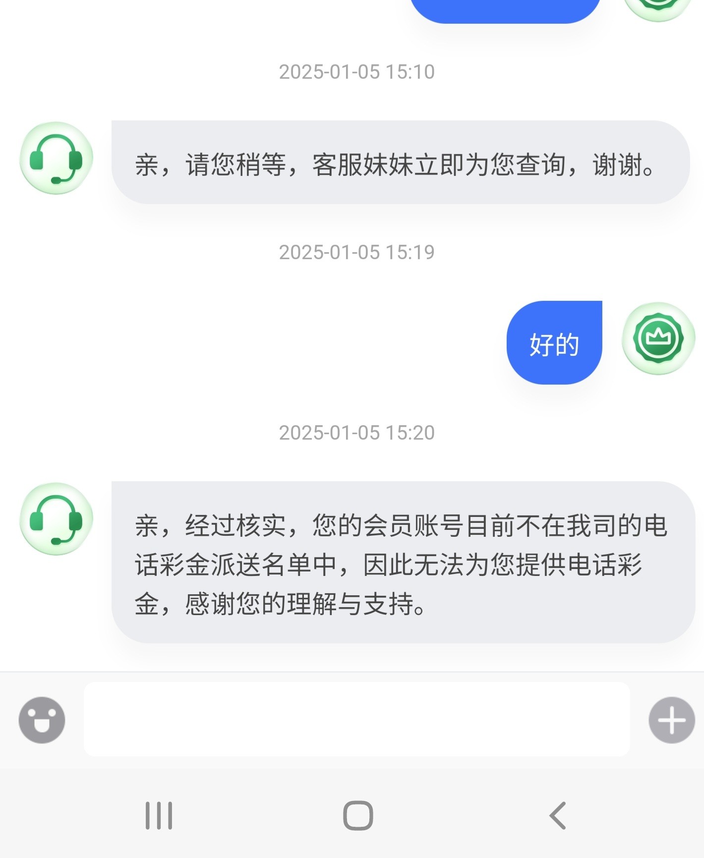 亲,经过核实,您的会员账号目前不在我司的电话彩金派送名单中,因此无法为您提供电话彩金,感谢您的理解与支持。