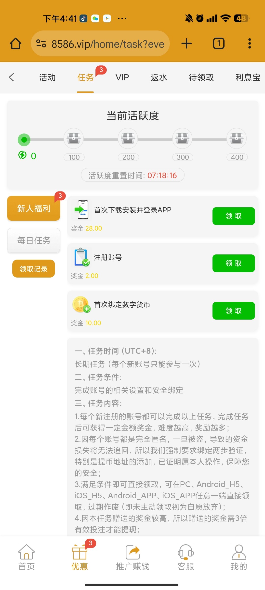微信好友申请给的网址, 不知道要不要特邀,注册下载app登陆然后在网页领取任务彩金,有就有没有就没有吧。
