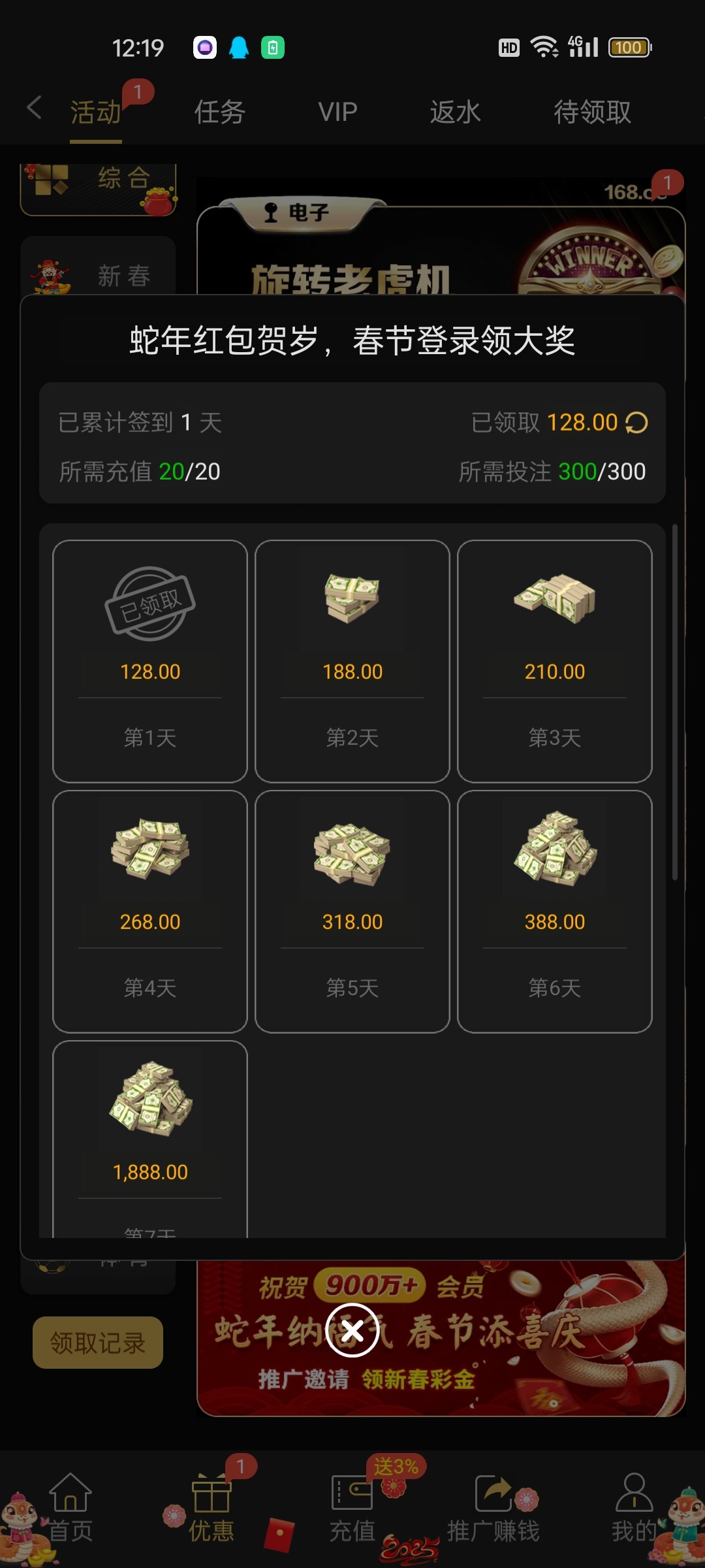 20+16出了六百 充值的投注满300记得领蛇年福利签到128彩金出了700 20出1300
