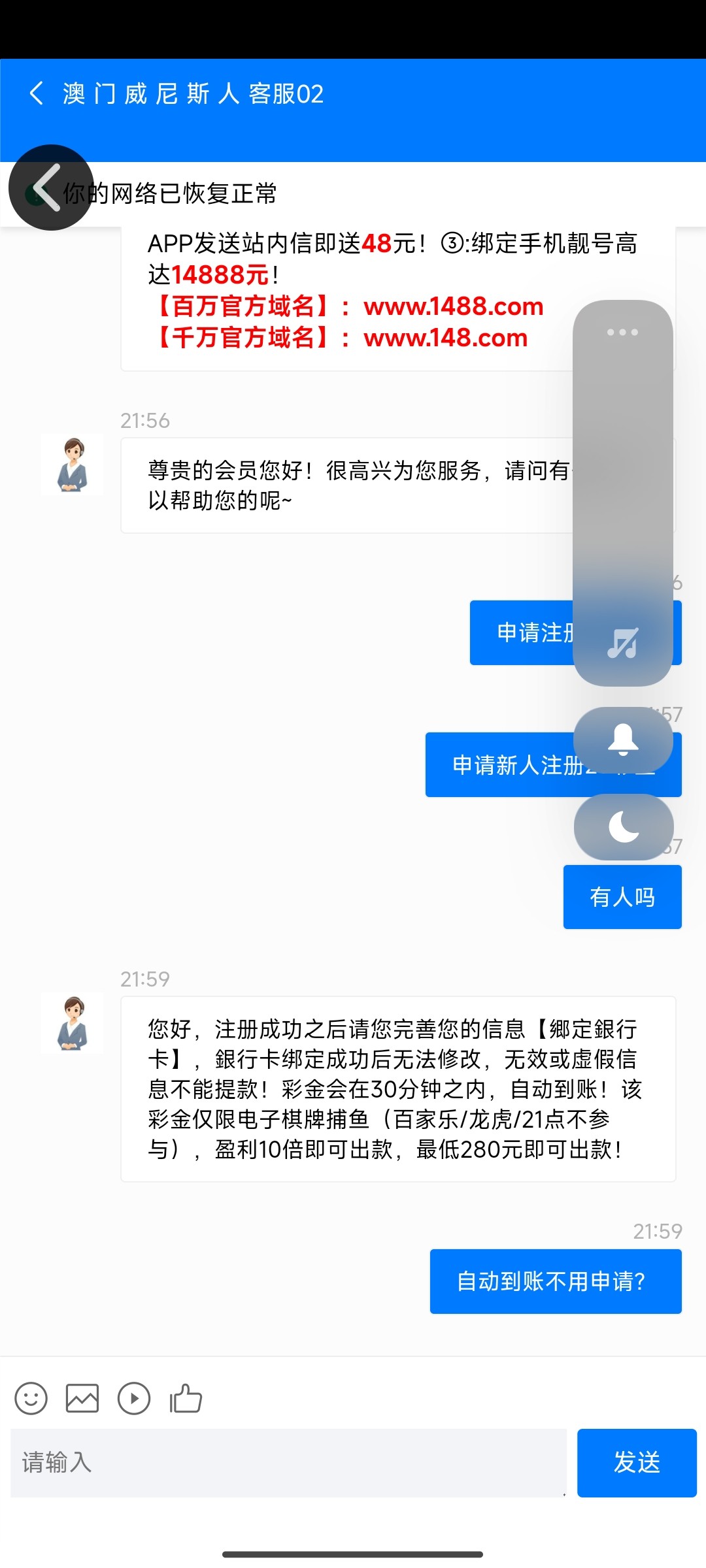 您好,注册成功之后请您完善您的信息【郷定銀行卡】,銀行卡绑定成功后无法修改,无效或虚假信息不能提款!彩金会在30分钟之内,自动到账!该彩金仅限电子棋牌捕鱼(百家乐/龙虎/21点不参与),盈利10倍即可出款,最低280元即可出款!