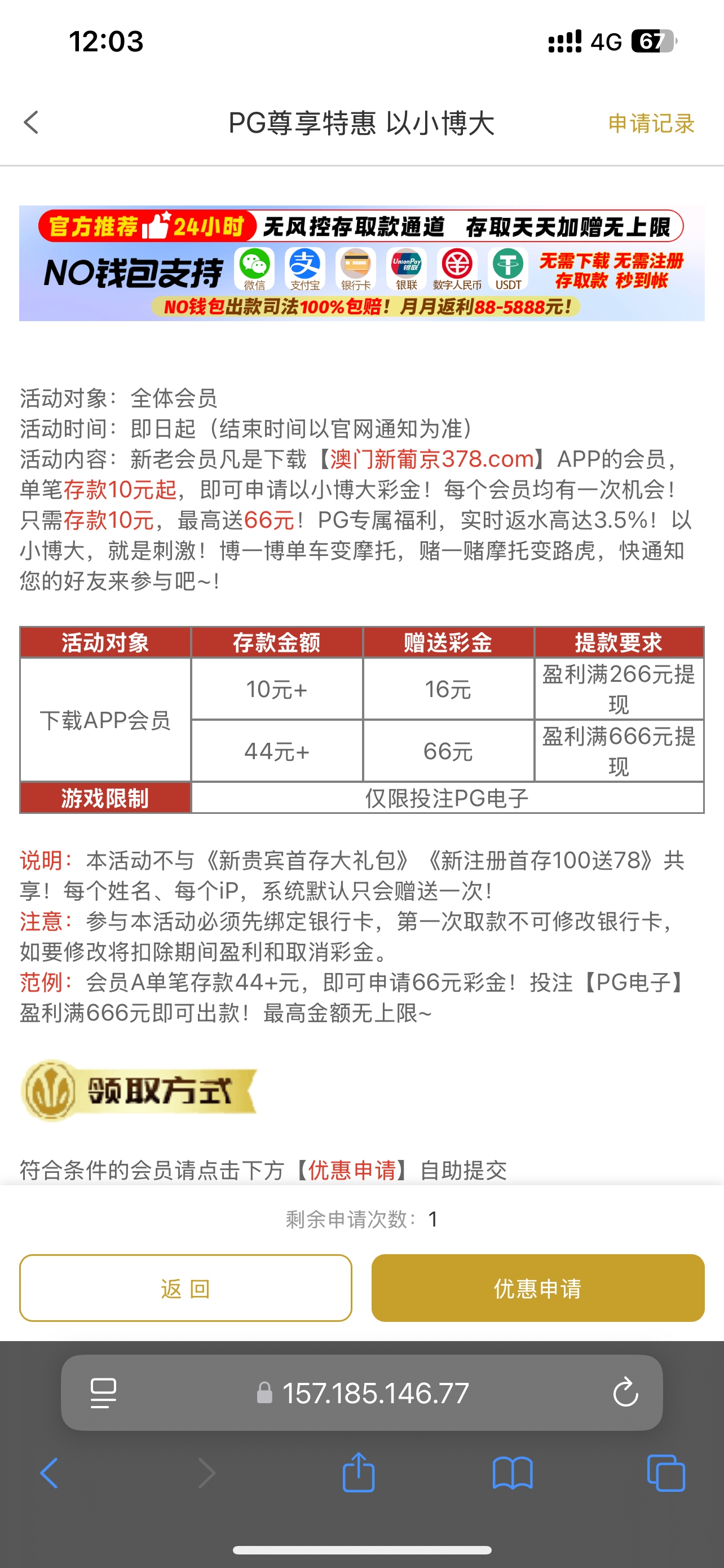 100+78自助申请,优惠申请没次数的自己联系客服反馈!退出账号重新进去就有优惠申请次数了!审核通过很快,我5分钟左右就通过了,我没打出来黑不黑不知道风险自测!网址378.com