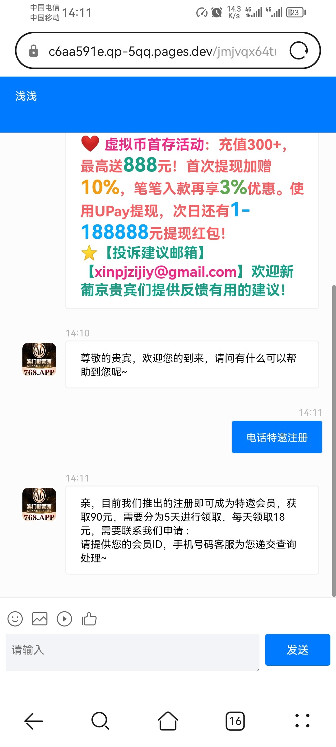 电话特邀老哥们可以去碰瓷一下送90分5天送。电话客服还给了兑换码768111,彩金要找在线客服领取,他没问我兑换码。如果问,老哥们发这兑换码给他768.app