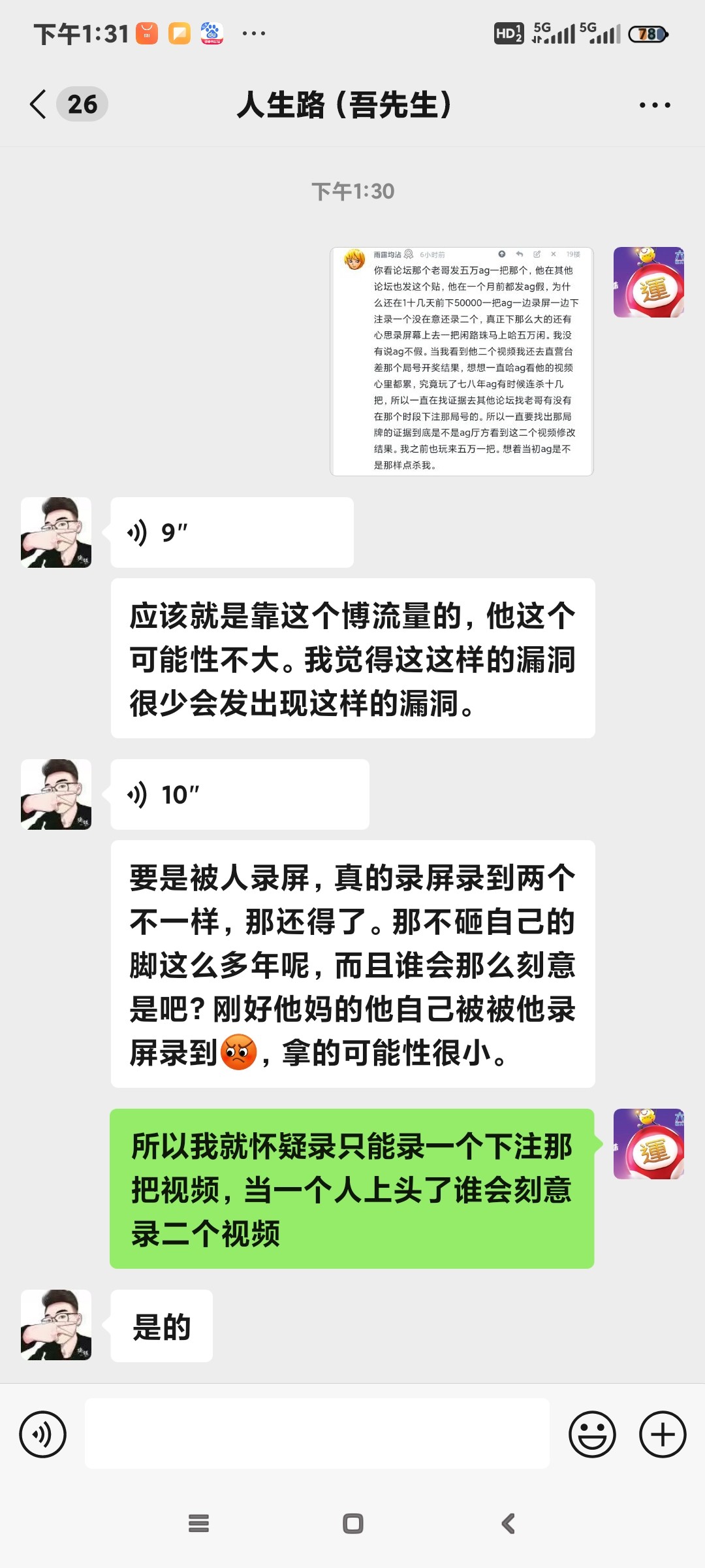 你看论坛那个老哥发五万ag一把那个,他在其他论坛也发这个贴,他在一个月前都发ag假,为什么还在1十几天前下50000一把ag一边录屏一边下注录一个没在意还录二个,真正下那么大的还有心思录屏幕上去一把闲路珠马上哈五万闲。我没有说ag不假。当我看到他二个视频我还去直营台差那个局号开奖结果,想想一直哈ag看他的视频心里都累,究竟玩了七八年ag有时候连杀十几把,所以一直在找证据去其他论坛找老哥有没有在那个时段下注那局号的。所以一直要找出那局牌的证据到底是不是ag厅方看到这二个视频修改结果。我之前也玩来五万一把。想着当初ag是不是那样点杀我。