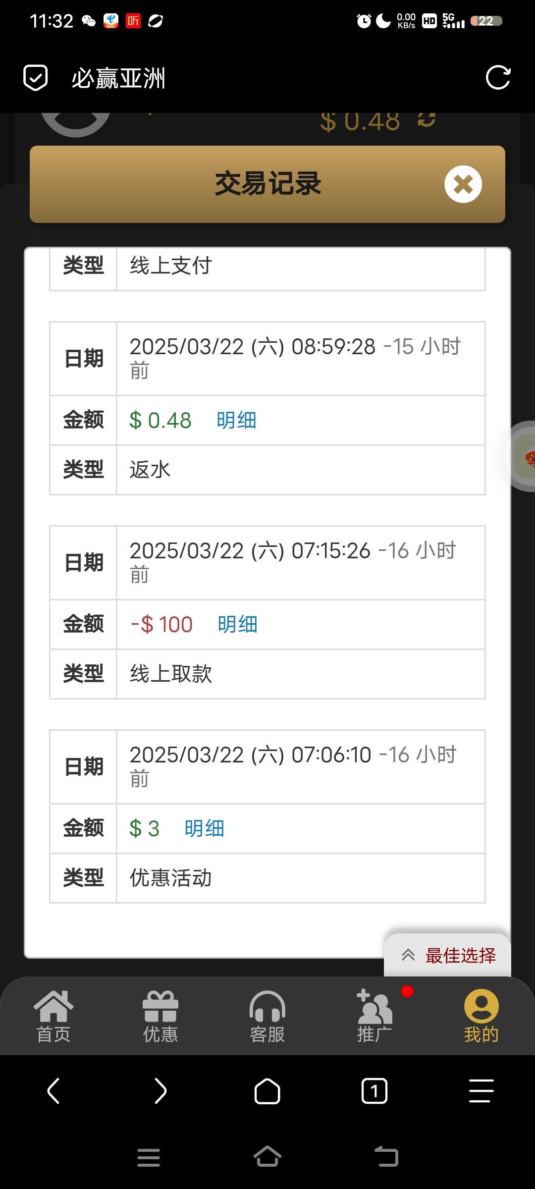 昨天我也是,到处找彩金薅羊毛,发现3339有4毛我都不放过,后面出了60