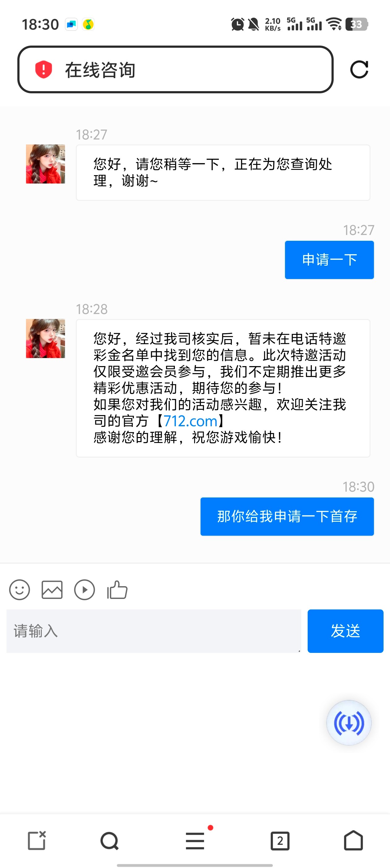 网址 www.712.com,今天来的特邀找客服先送了18彩金没打出来,客服说我可以参加100+100三杯水不能打彩票,我出款了,大伙自己去找客服碰瓷试试有没有100+100