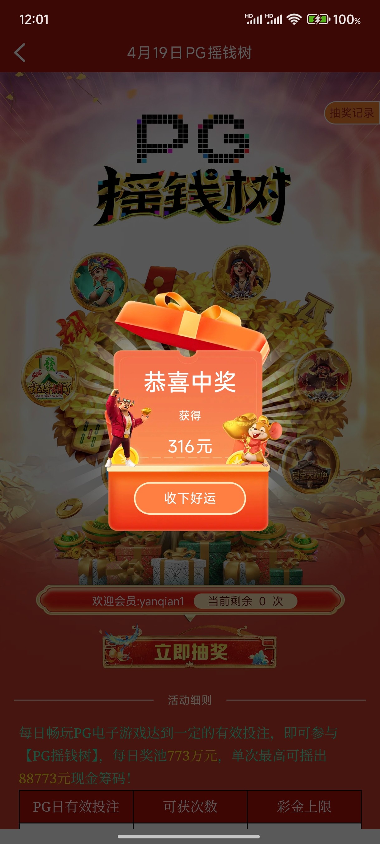 天天看你们773摇钱树抽到大的,前天还看到一个今天到我了(充两百打了2500流水)
