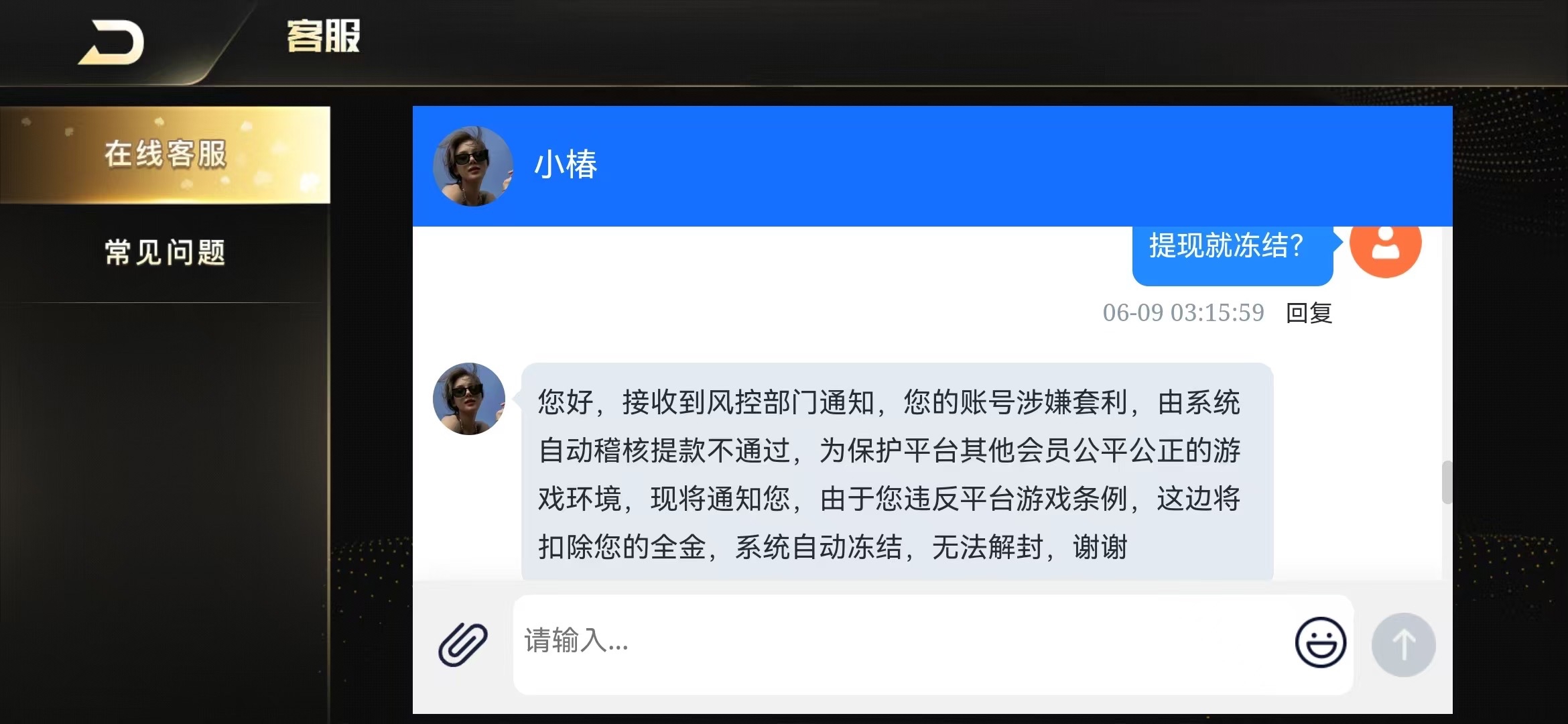 玩了五年的平台,前几天卡密充值黑了我,然后提供充值录屏也不给我处理。玩了5年的以小博大,天天玩,今天再玩不给我通过了,说不符合。今天充值打的电子,提现直接冻结账号,理由就是套利,哈哈,玩电子套利。这狗日平台改名应该就是换老板了,司马平台,玩了五年,想不到既然今天给我黑了