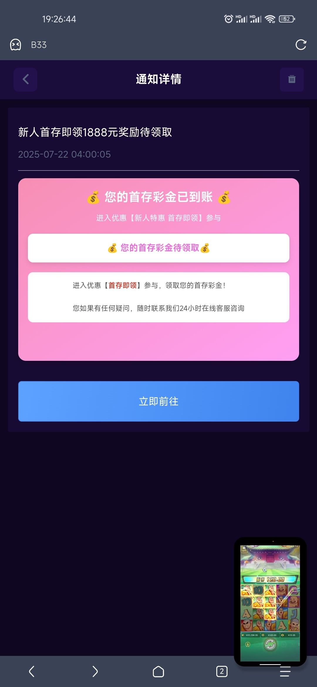 之前充值过没有领取的上号看看,我这号800多天前注册参加的狗推代理链接打过首存,当时送了首存彩金,现在补发的好像是优惠里的