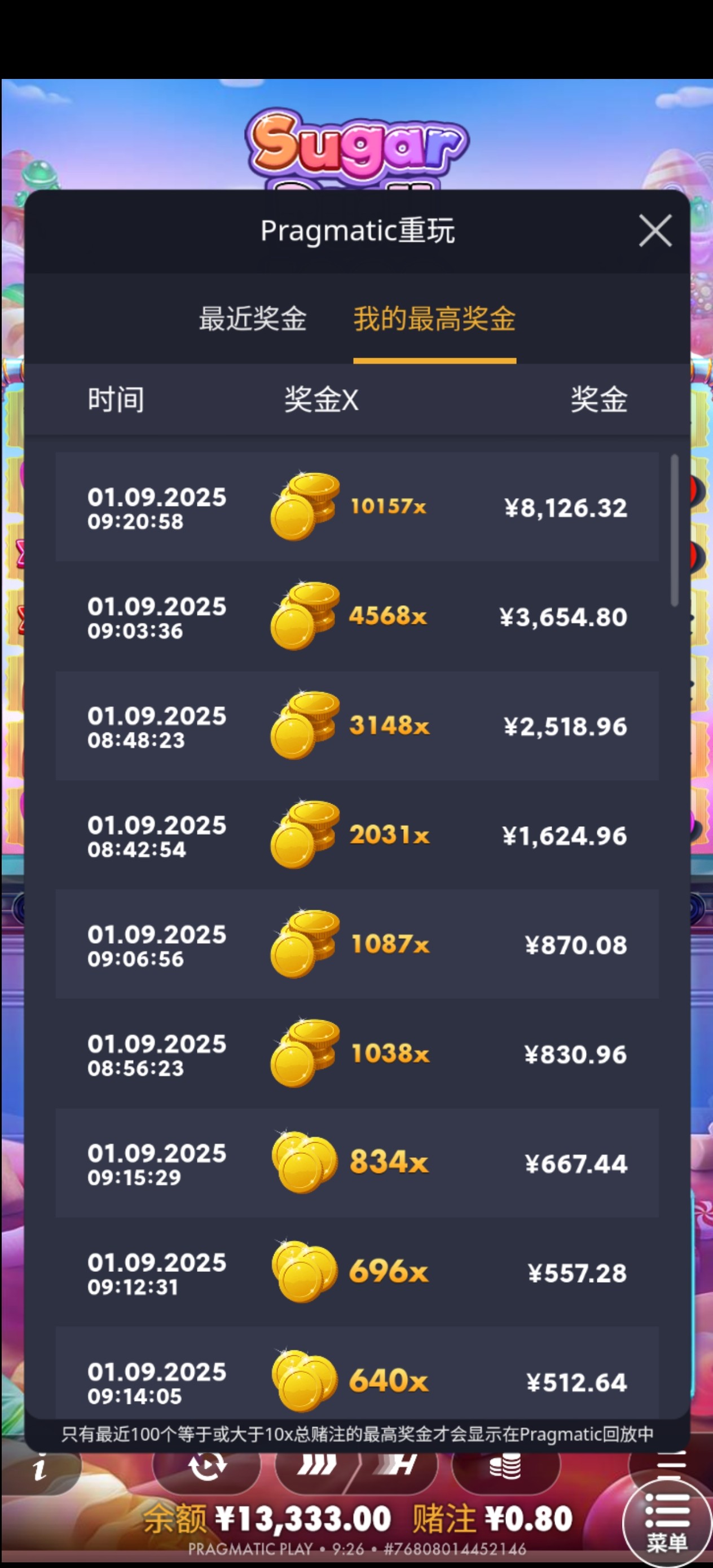 前天充600打20万流水爆23000倍,今天又爆10000倍,前天那个差一下就满倍可惜了
