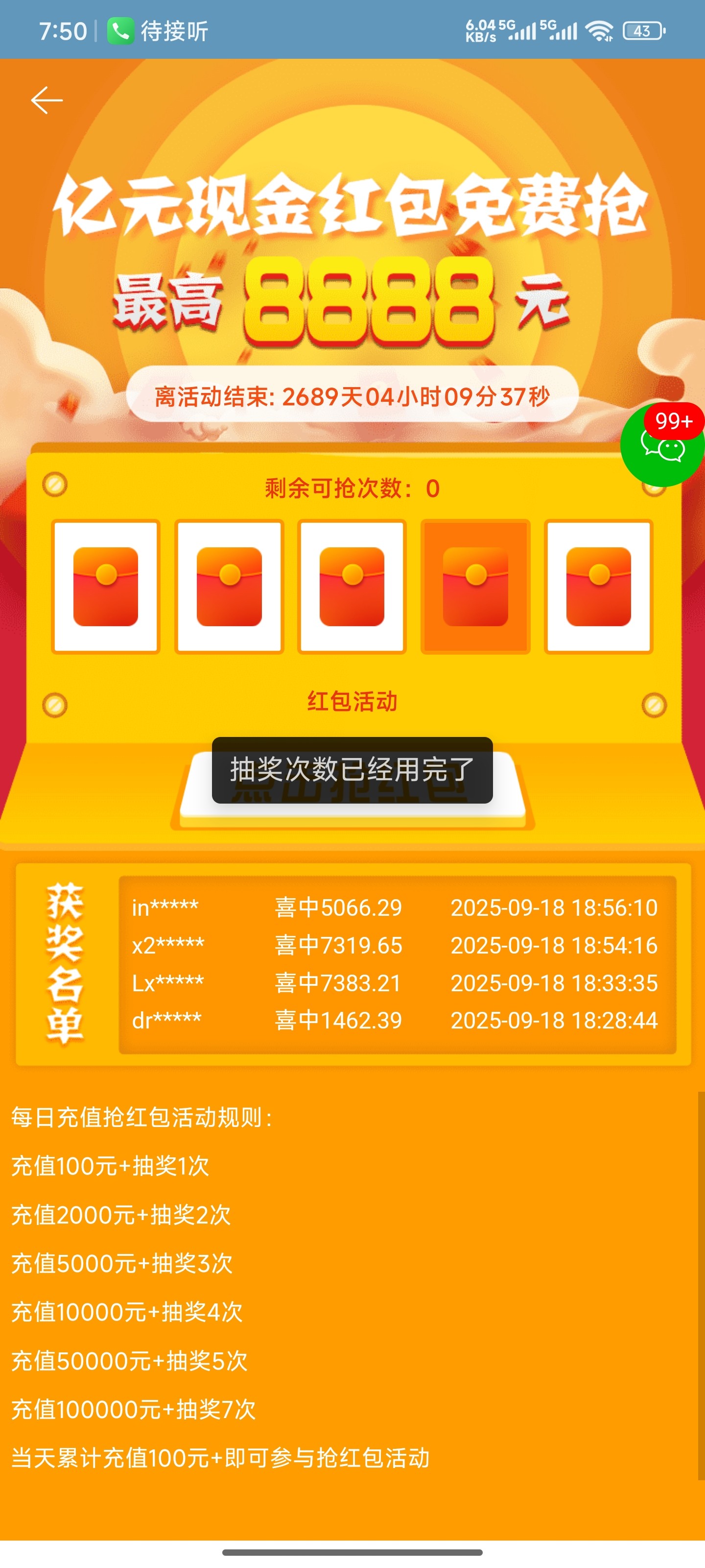 解释一下,这个是电话回访彩金,不需要充值,有给你打电话的话,漏接了也能上去就能领取红包39,上去没有次数的无视即可,刚注册的也无视,一站也可以去看看