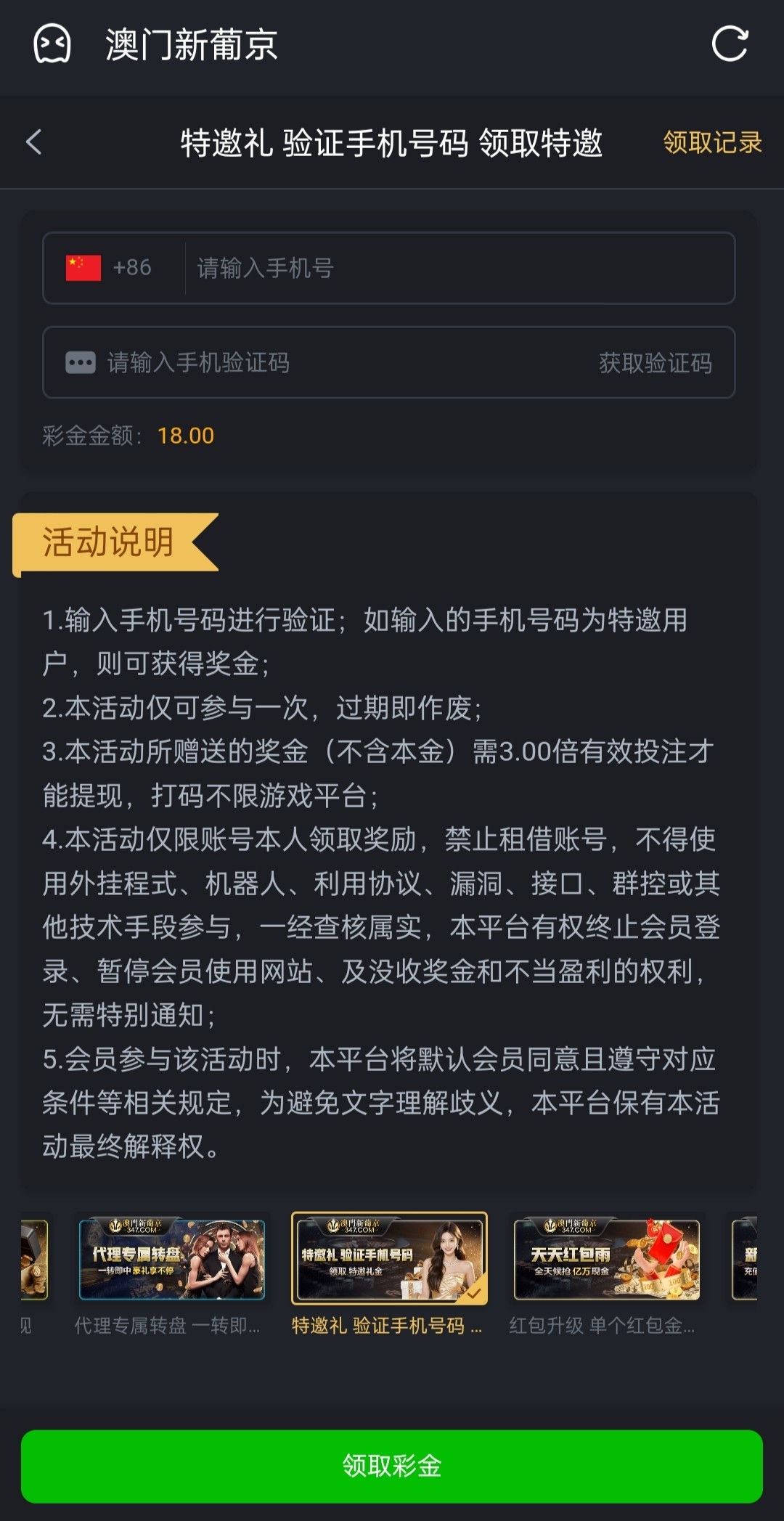 新用户注册优惠里面自助验证领取18彩金,有就有没有无视吧