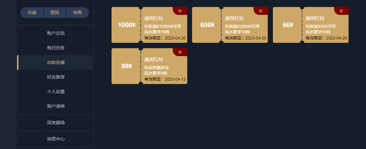 qm21.vip  这个网站我充值过几百,今天接到电话,送了几张优惠券,位置在个人中心-自助优惠,有几张需要充值才能用,有一张88是无需充值的,没有场馆限制,需要三倍流水,碰瓷试试吧,估计不好碰,买了今天晚上JDG -1.5 冲冲冲。