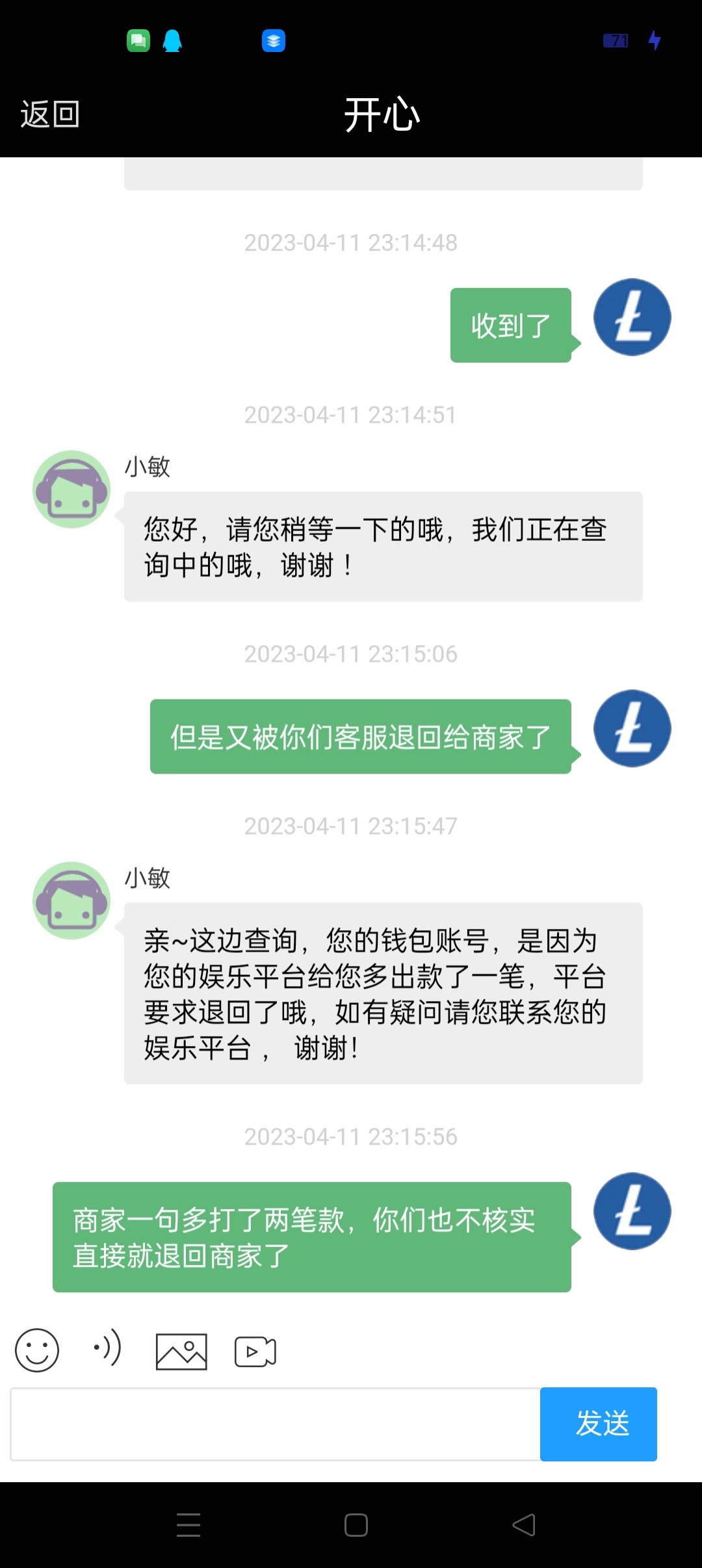 今天充了100,在一个平台打到1000提了255银行卡到了,然后剩下800提币,基本上都秒了,过了一会,客服不经过核实直接把币退,问客服你们看图,我就想说如果我去一个平台充值500输完了,再来找虚拟币客服,说狗庄没给我上分他会退回吗?