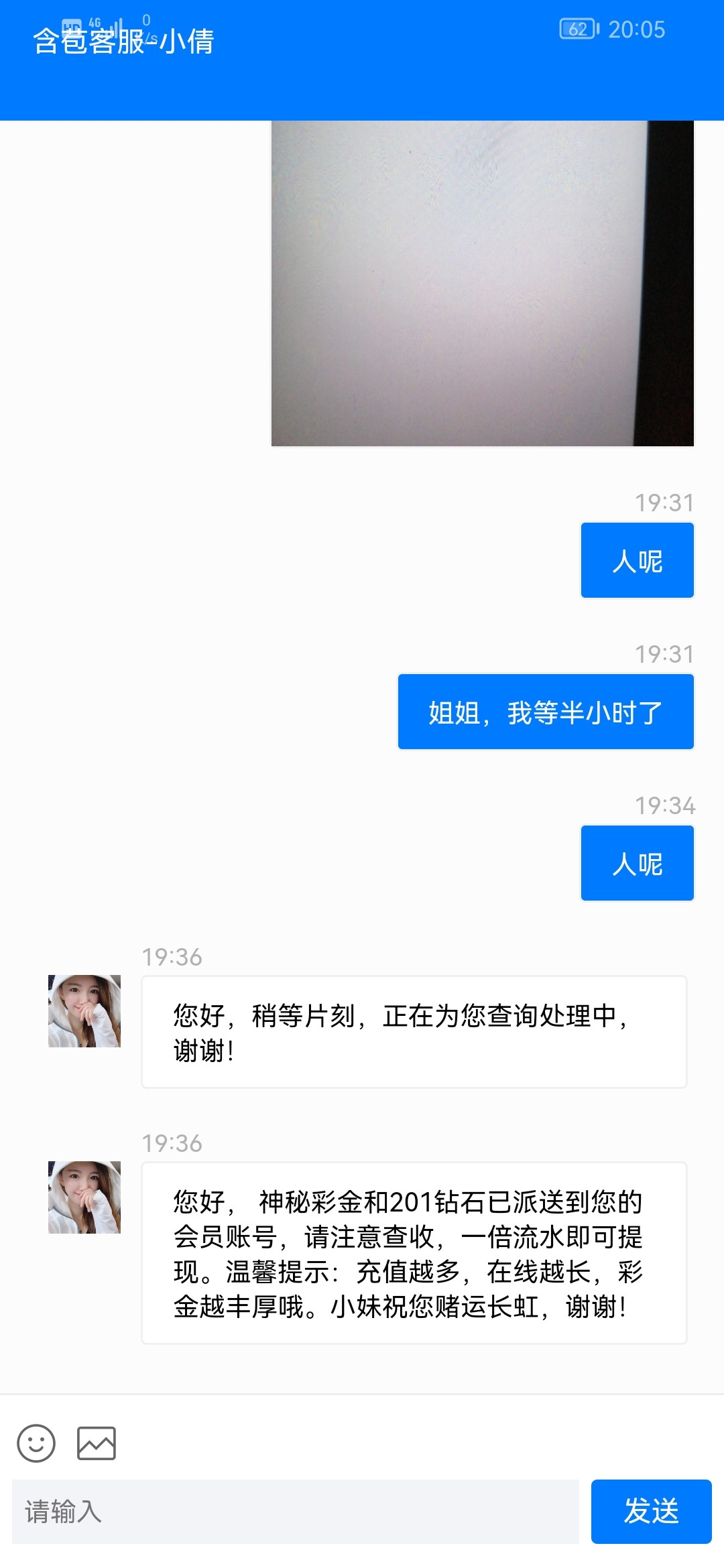 估计刚刚 那一会 玩的人太多了, 客服全部加了流水, 现在人少, 就正常就给出了