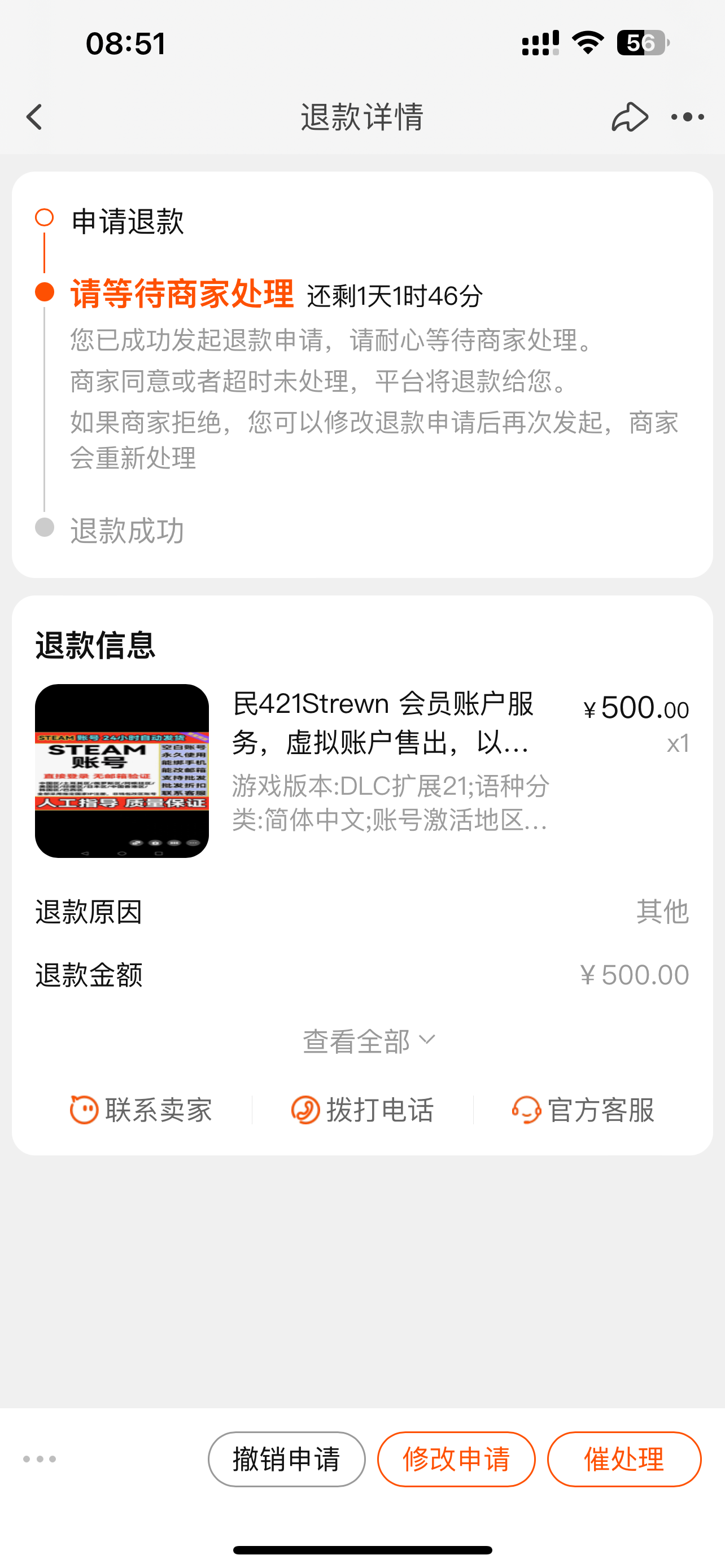 还得等两天自动退款