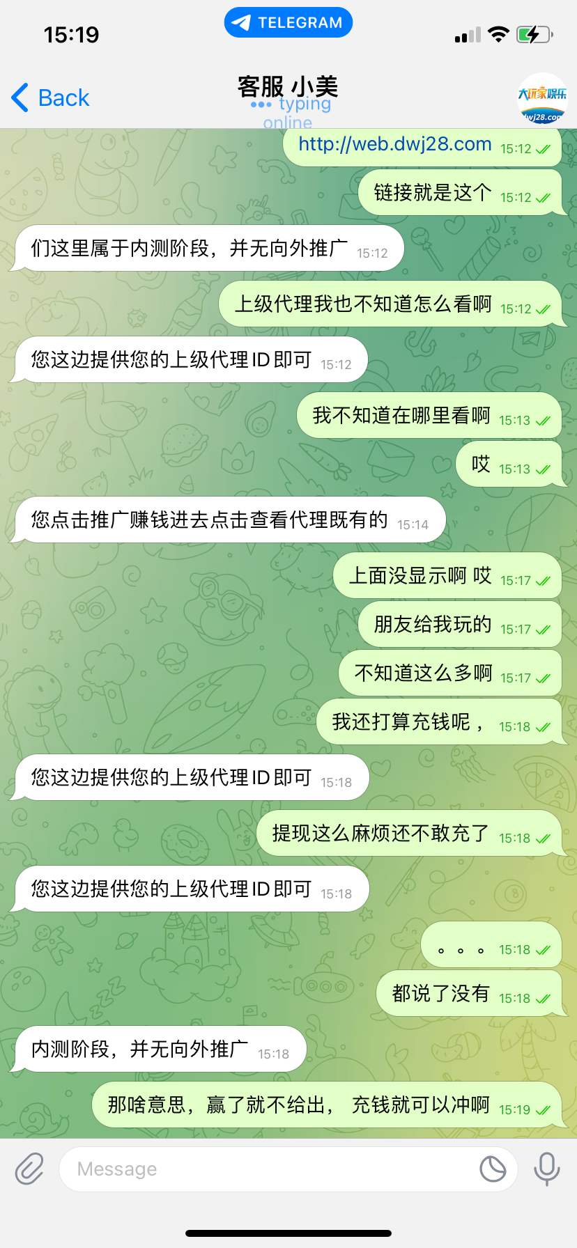 客服说是 内测 ,没有向外推广 ,问我 要代理ID 才可以提现